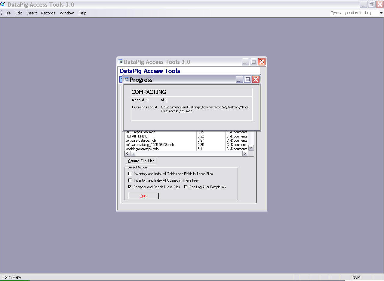Developer Provided Description - "Perform compact and repair on all your Access .mdb files, Create an index of all Tables and Fields in your databases, and Create an index of all Queries in your databases."