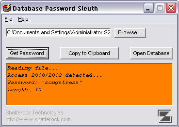 Download URL - dbpwd.zip Developer - Shatterock Technologies OS - Windows 95/98/ME/NT/2000/XP File Size - 1.78 MB Supported Software Versions or File Systems - Microsoft Access 95/97/2000/2002(xp) Developer Provided Description - "Did you ever forget or misplace your database password? Database Password Sniffer instantly recovers the opening password from Microsoft Access 95/97/2000/2002 databases in one quick and easy step. Works fast an actually recovers the password almost instantly." Comment - Not currently available. May be added later.