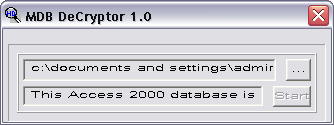 Download URL - mdbdc.zip Developer - SG Soft OS - 98/ME/NT/2000/XP File Size - 4.3 KB Supported Software Versions or File Systems - MS Access 95/97/2000 Developer Provided Description - "This small utility is intended for decrypting databases created by MS Access 95/97/2000. This can be useful if the encrypted database has been damaged and can't be restored by authorized tools and it is necessary to get the contents of the database's file decrypted for further recovering." Comment - Great idea, but unless I misunderstand, a password protected database is encrypted, and my Access 2000 file was labeled by this program as unencrypted.