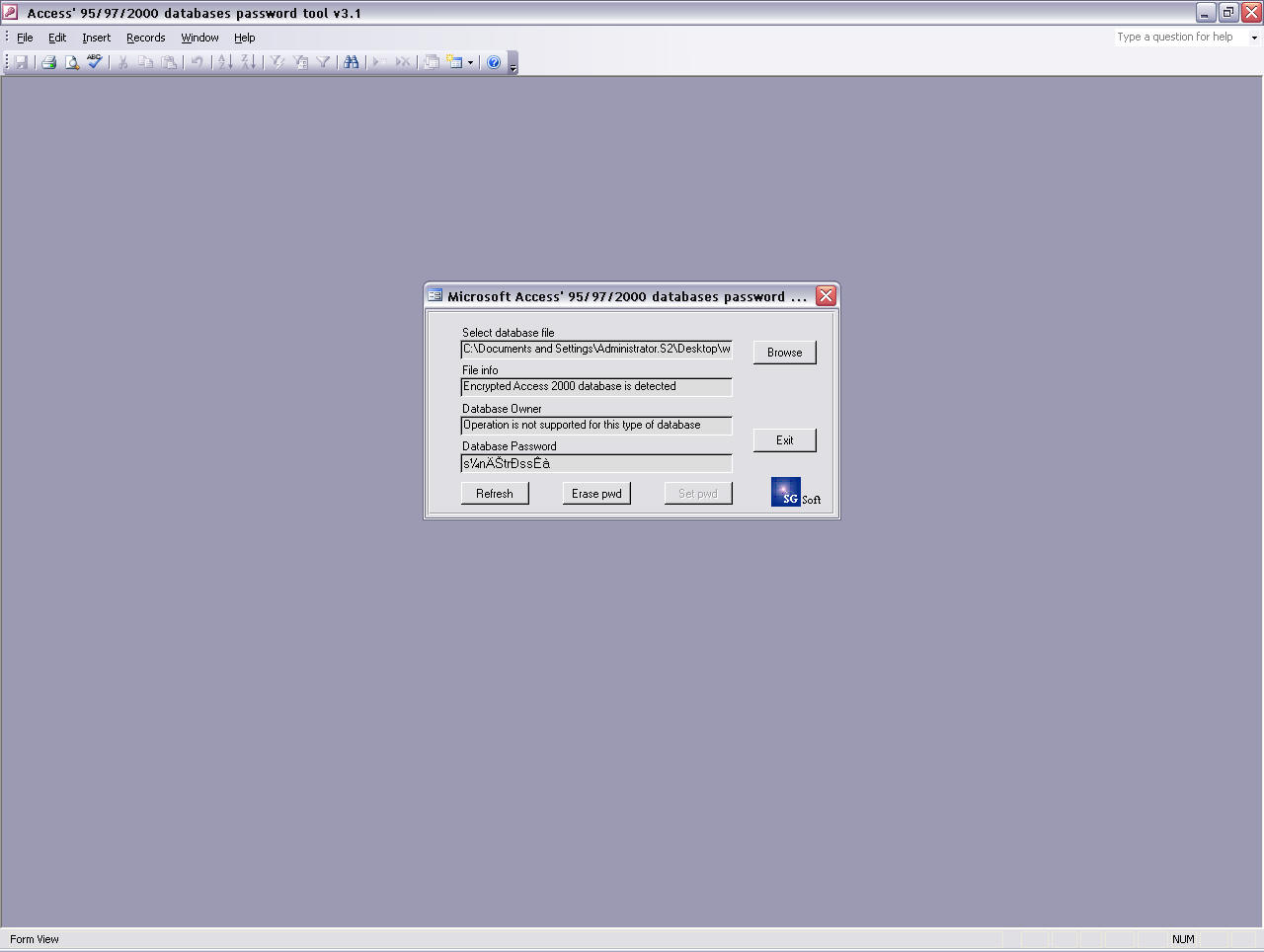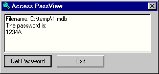 Download URL - msapt.zip Developer - SG Soft OS - 98/ME/NT/2000/XP File Size - 93 KB Supported Software Versions or File Systems - MS Access 95/97/2000 Developer Provided Description - "This utility is designed for viewing and changing the password of the MS Access' 95/97/2000 databases files. For MS Access 97 database, the program shows the information on the owner of a database: user's name and PID." Comment - Doesn't seem to work very well in my Access 2003. It did get some of the letters right. Perhaps it is using the wrong character set.
