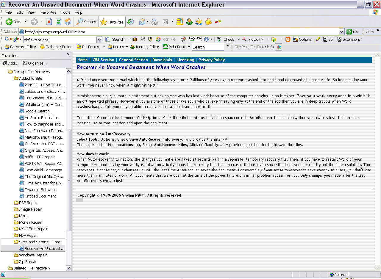 Download URL - http://skp.mvps.org/wrd00015.htm Developer - Shyam Pillai OS - Windows File Size - Not Applicable (Online Guide) Supported Software Versions or File Systems - ? Developer Provided Description - "A friend once sent me a mail which had the following signature: "Millions of years ago a meteor crashed into earth and destroyed all dinosaur life. So keep saving your work. You never know when it might hit next!"