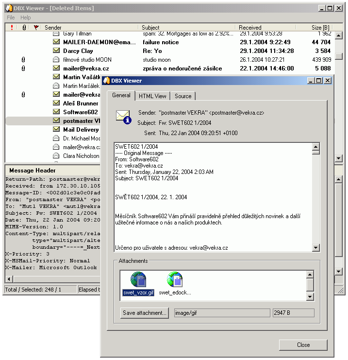 DBX Recovery SoftwareDBX is the file extension and type of Outlook Express file for versions 5 and 6.Name - Outlook Express Message Extractor Download URL - http://www.gaijin.at/download/oemsgxtr.rar Developer - Gaijin.at / Werner Rumpeltesz? OS - Windows File Size - 59.90 KB Developer Provided Description - "With the Outlook Express Message Extractor can extract e-mails and news articles from Outlook Express DBX files. In this case all messages from DBX file is exported to a separate directory as EML and NWS files. So they can be opened with Outlook Express or other mail client or converted to another format." Comments - None Yet Name - Power Email Recovery for OE Download URL - http://www.mt-solution.ca/download/peroe.exe Developer - MiniTool Solution Ltd. OS - Windows 98/Me/NT/2000/XP/2003/Vista. File Size - 549.80 KB Developer Provided Description - "Power Email Recovery for Outlook Express is a professional data recovery software that recovers damaged *.dbx files where MS Outlook Express stores folders with messages. It also recovers accidentally deleted messages. The unique recovery technology allows the user to read damaged *.dbx files created by Outlook Express and recover accidentally deleted messages. Recovered messages are in the .eml format and can be imported into Outlook Express mail and news bases." Comments - None Yet Name - UnDBX Download URL - http://software-files-a.cnet.com/s/software/11/38/63/88/undbx-0.20.zip Developer - Avi Rozen OS - Windows XP File Size - 45.23 KB Developer Provided Description - "Tool to extract, recover and undelete e-mail messages from Outlook Express .DBX files. On first run all messages are extracted as individual .EML files. Subsequent runs only update the output directory with new messages, and delete old .EML files that correspond to deleted messages in the .DBX file. Corrupted .DBX files (including files larger than 2GB) can be opened in recovery mode, in order to recover messages and partially undelete deleted messages. The success of recovery depends on the type and level of .DBX file corruption." Comments - None Yet Name - DBXtract Download URL - DBXtract Developer - Stephen L. Cochran OS - Windows 98/ME/2000(Service Pack 2 or higher)/XP/2003 File Size - 300 KB Supported Software Versions or File Systems - Outlook Express 5/6 Developer Provided Description - OE5 and OE6 have a proprietary binary format that makes archiving individual messages difficult. In addition, a number of people have indicated that their message folders have become corrupted and OE can not read them. Consequently, they have lost all the messages in that folder. OBXtract extracts all mail and news messages from individual dbx files. After extracting the messages one can drag them from a Windows Explorer folder into an Outlook Express mail folder. It requires the existence of the VB6 runtime dll, msvbvm60.dll. If you do not have that in your Windows\system (or system32 for NT / 2000) directory, you can download it directly from Microsoft, by CLICKING HERE. The program runs in Windows 9X, WinMe, NT, Windows 2000, Windows XP, and Windows Server 2003. After installing the VB6 runtime files, you can then run DBXtract." Comment - No Longer Free. Now costs $5. Name - OE Viewer Download URL - OEView.zip Developer - MiTeC OS - Windows 9x/Me/NT 4.x/2000/XP/Server 2003 File Size - 560 KB Supported Software Versions or File Systems - OE 4, 5, and 6 Developer Provided Description - Viewer for standalone files containing Microsoft Outlook Express 4,5 and 6 message database (*.idx/*.mbx/*.dbx). It displays list of contained messages and their header. Message can be viewed in detailed view including attachments (save ability) and HTML preview and printing. Messages can be saved to *.eml files. Comment - Not currently available. May be added later. Download URL - MailSalvation_setup.exe Developer - Softlakecity.com OS - Windows File Size - 446 KB Supported Software Versions or File Systems - OE 5 and above Developer Provided Description - "This an email utility for Microsoft Outlook Express users. It can help you recovering emails and attachments from a disaster. It can help you reading corrupted mail databases, it can read your mail backups easily, it can help you migrating your mail database from Outlook Express to any other mail client on any operating ( Windows, Linux, Unix, BeOS..). If your software and system can read internet emails you can do it easily with this utility with it's "universal export function". A unique option is the one to automatically extract and backup all email attachments You can also easily extract all email attachments This program has a virus safe preview for emails, emails with exploit Outlook Express bugs and vulnerabilities cannot harm you if you when you use the built in quick preview." Comment - Not currently available. May be added later. |