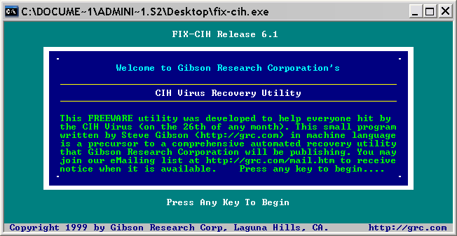 Download URL - Download Here Developer - Steve OS - Windows File Size - 21 Kb Supported Software Versions or File Systems - FAT/NTFS Developer Provided Description - "The CIH virus attempts to ERASE the writable FLASH BIOS of infected PC's, and also overwrites the first 2,048 sectors (1,048,576 bytes) of all of the system's available non-removable writable disk drives! While this behavior places the CIH virus among the nastiest of all viruses, the damage is more recoverable than at first appears.." Comment - Not currently available. May be added later.