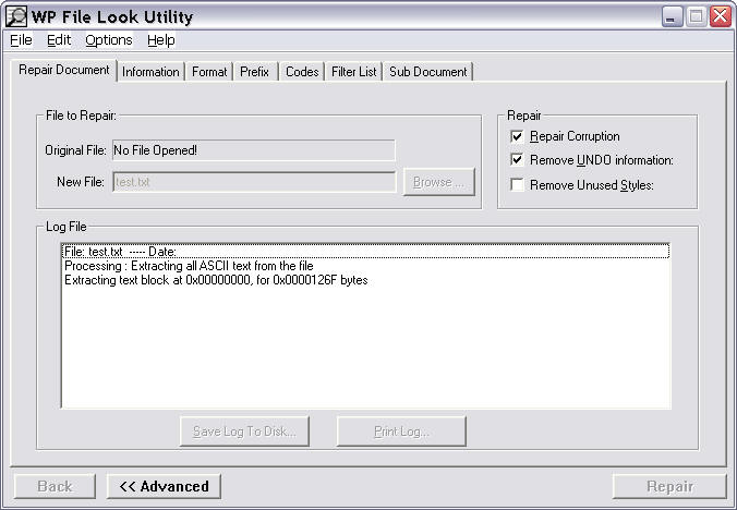Download URL - WPLOOK Developer - Corel OS - Windows 98/ME/2000(Service Pack 2 or higher)/XP/2003 File Size - 516 KB Supported Software Versions or File Systems - Most versions of WordPerfect Developer Provided Description - "If you already know about the WPLOOK utility, it was most likely recommended for recovering a corrupted document. There is a Repair option that can (hopefully) repair corruption, remove Undo information and remove unused styles. To repair a document, open the WPLOOK utility (see Figure 1). Choose File, Open so you can select the corrupted file. At this point, you may get a reminder that you can select multiple files and have WPLOOK run a corruption check and/or repair the entire group of files. The details can be saved to a log file if necessary. If you don't see this message, someone must have turned it off already. You can turn it off by checking the Don't Show Me This Message Again! check box." Comment - Comprehensive article with download link for WPLOOK which can recover corrupt WordPerfect files. This looks like an effective program.